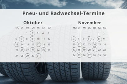 Wir freuen uns, dir die folgenden Pneuwechseltage anzubieten! Der Pneu- oder Radwechsel dauert nur 30 Minuten – genug Zeit, um entspannt einen Kaffee oder ein Wasser zu geniessen, während du auf dein Fahrzeug wartest. Ergänze deinen Termin mit unserem Wintercheck und starte rundum sorglos in die kalte Jahreszeit! Nutze unser Kontaktformular und sichere dir deinen Wunschtermin. Wir freuen uns auf dich!